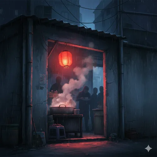 Thanh dừng lại trước một quán hủ tiếu nhỏ, không có biển hiệu, chỉ có một lồng đèn đỏ treo hờ hững trước cửa, ánh sáng yếu ớt của nó vật lộn với bóng tối. Khói từ nồi nước lèo nghi ngút, mang theo một mùi hương vừa quen thuộc vừa bí ẩn. Đây là "quán hủ tiếu ký ức" của Bà Sáu, một cái tên mà chỉ những người trong giới mới biết.