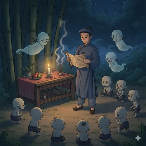 An không để tâm đến họ. Chàng trải giấy ra, mài mực, và dưới ánh nến leo lét, chàng bắt đầu viết. Chàng không viết bùa, cũng không chép kinh. Chàng viết một bài văn tế, một bài văn ngắn để tế những linh hồn bơ vơ. Lời văn của chàng không dùng điển tích cầu kỳ, không dùng lý lẽ cao siêu, mà được viết bằng một giọng văn chân thành và giản dị nhất.