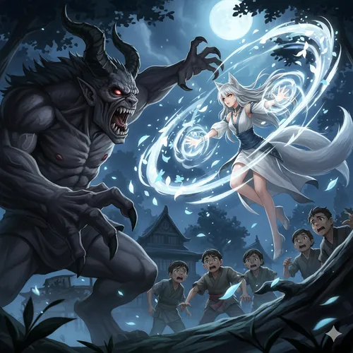 Nhưng đó chưa phải là tất cả. Nguyệt khẽ ngâm một câu thần chú cổ. Ánh trăng trên trời bỗng trở nên rực rỡ, chiếu một cột sáng bạc xuống ngay vị trí của nàng. Nàng đưa hai tay lên, gom ánh trăng lại thành một quả cầu ánh sáng chói lòa. Rồi, với một cái phất tay nhẹ nhàng, nàng phóng quả cầu ánh sáng đó về phía con yêu ma.
