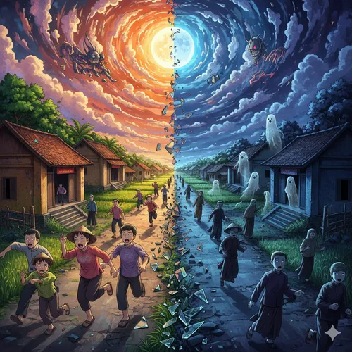 Luồng tà khí từ ngôi đền trong rừng Cấm lan ra với một tốc độ chóng mặt. Nó như một bệnh dịch vô hình, bao trùm lấy cả vùng quê. Bầu trời không còn trong xanh nữa, mà mang một màu vàng úa bệnh hoạn, dù đang là ban ngày. Một làn sương mù kỳ lạ, không tan, bắt đầu giăng mắc khắp các nẻo đường, mang theo mùi của đất ẩm và sự mục rữa.