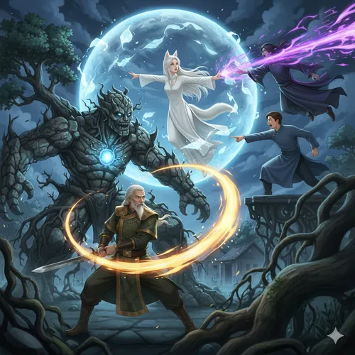 Nguyệt nhanh chóng hỗ trợ. Nàng không tấn công trực diện, mà dùng phép thuật để làm chậm bước tiến của một con thạch tượng, khiến những bước chân của nó trở nên nặng nề hơn. Nàng cũng tạo ra những tấm khiên ánh sáng để đỡ những đòn tấn công bất ngờ, bảo vệ cho Lão tướng.